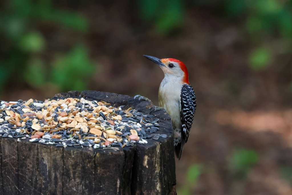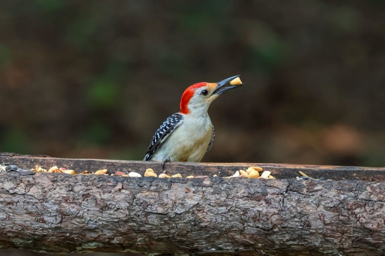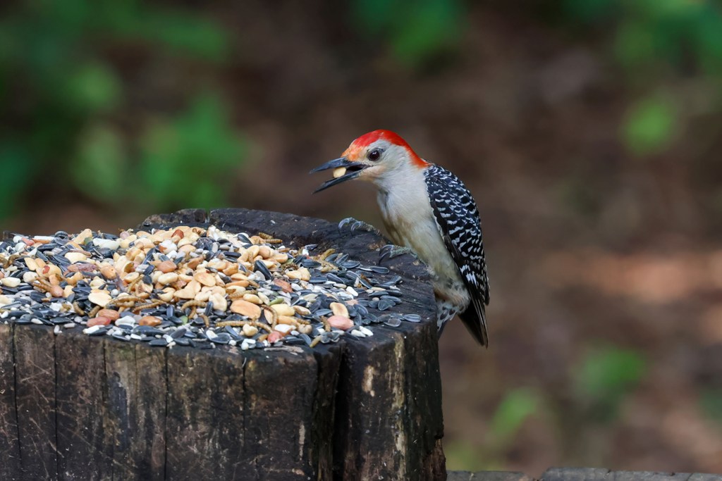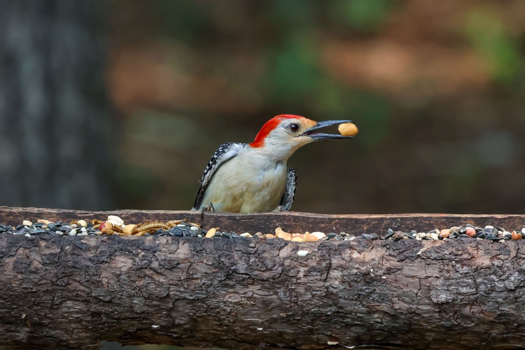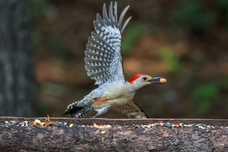 He kept swooping down to the feeding area, grabbing a quick peanut, and then quickly flying away.