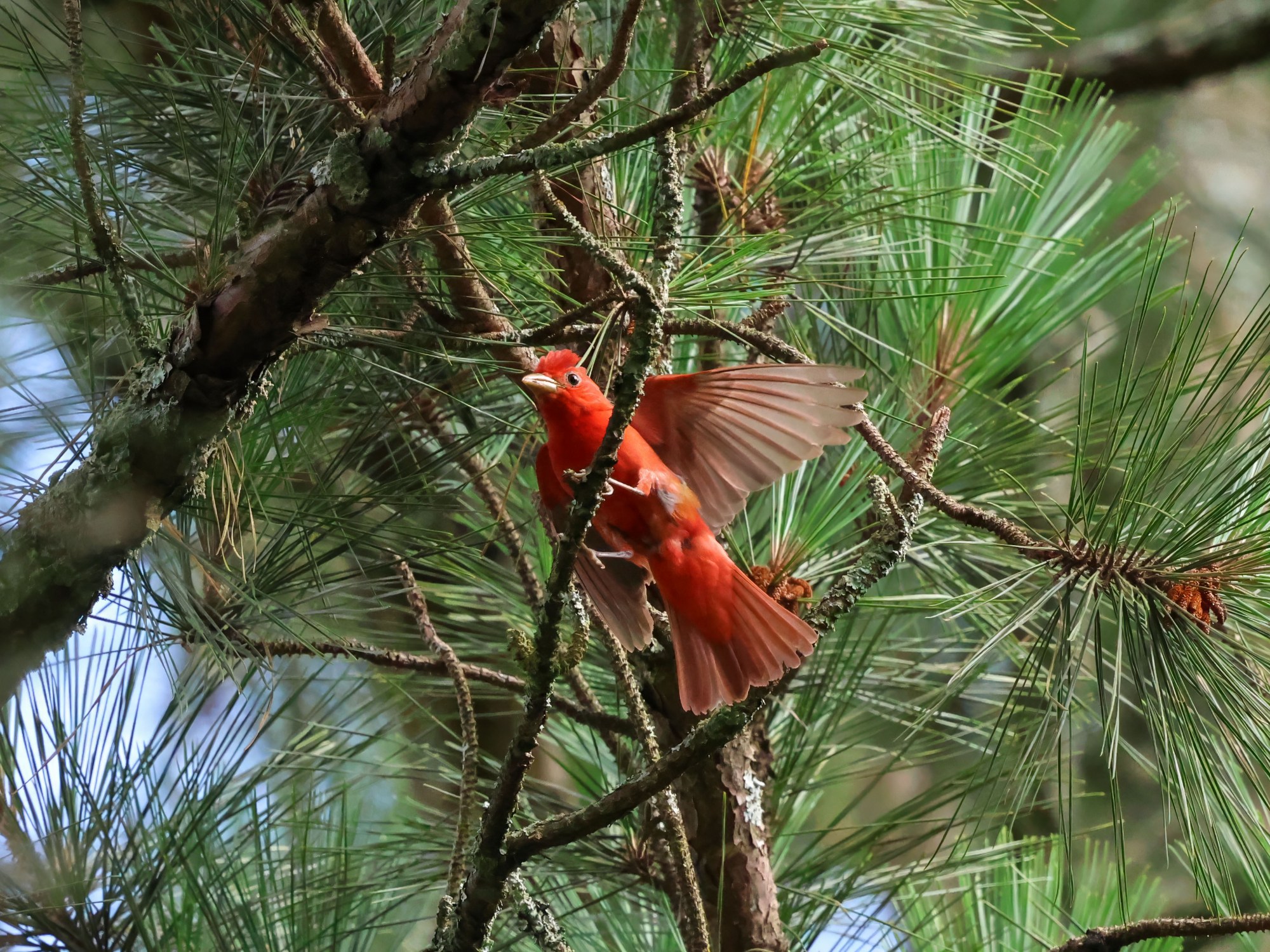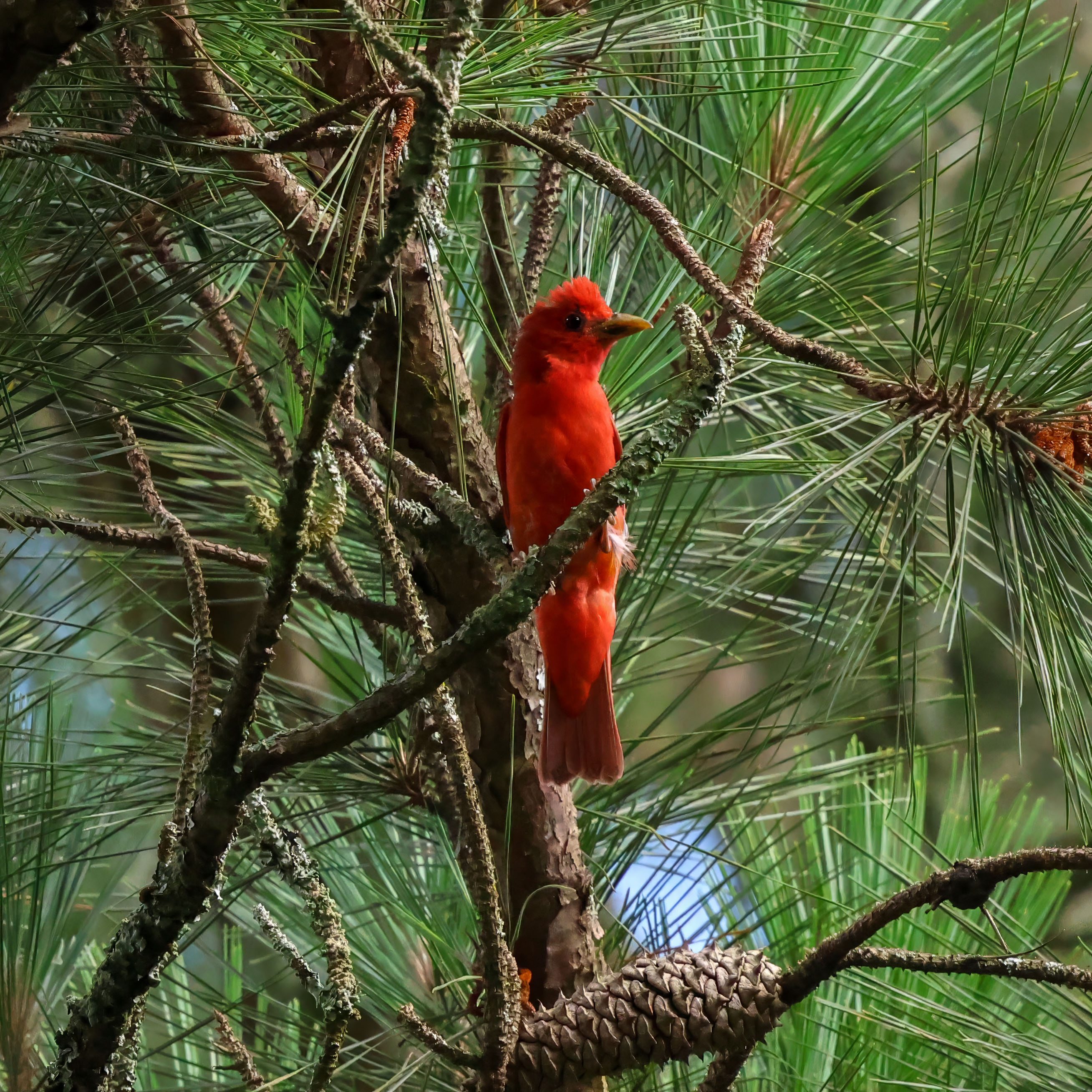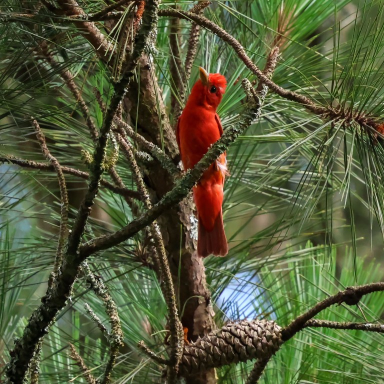 When I was out for a stroll awhile back, a stunning Summer Tanager, perched high up in a pine tree, caught my eye.