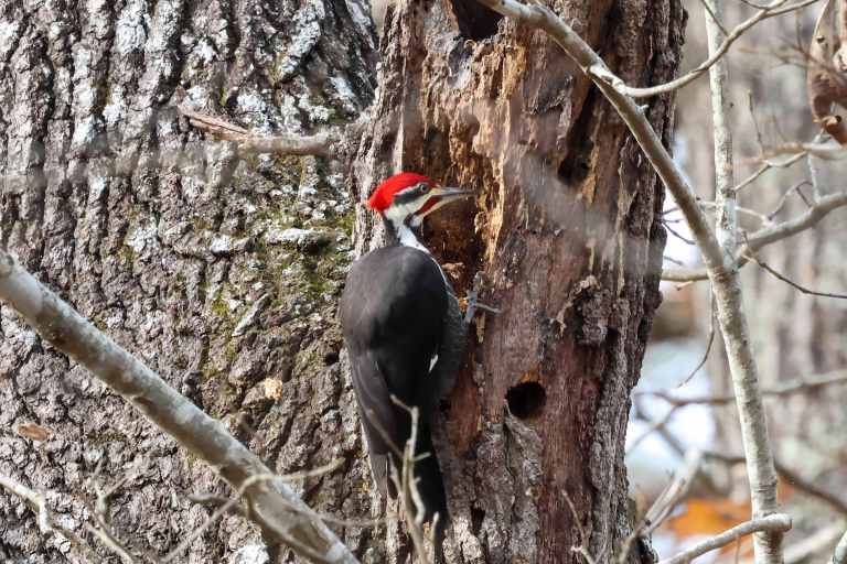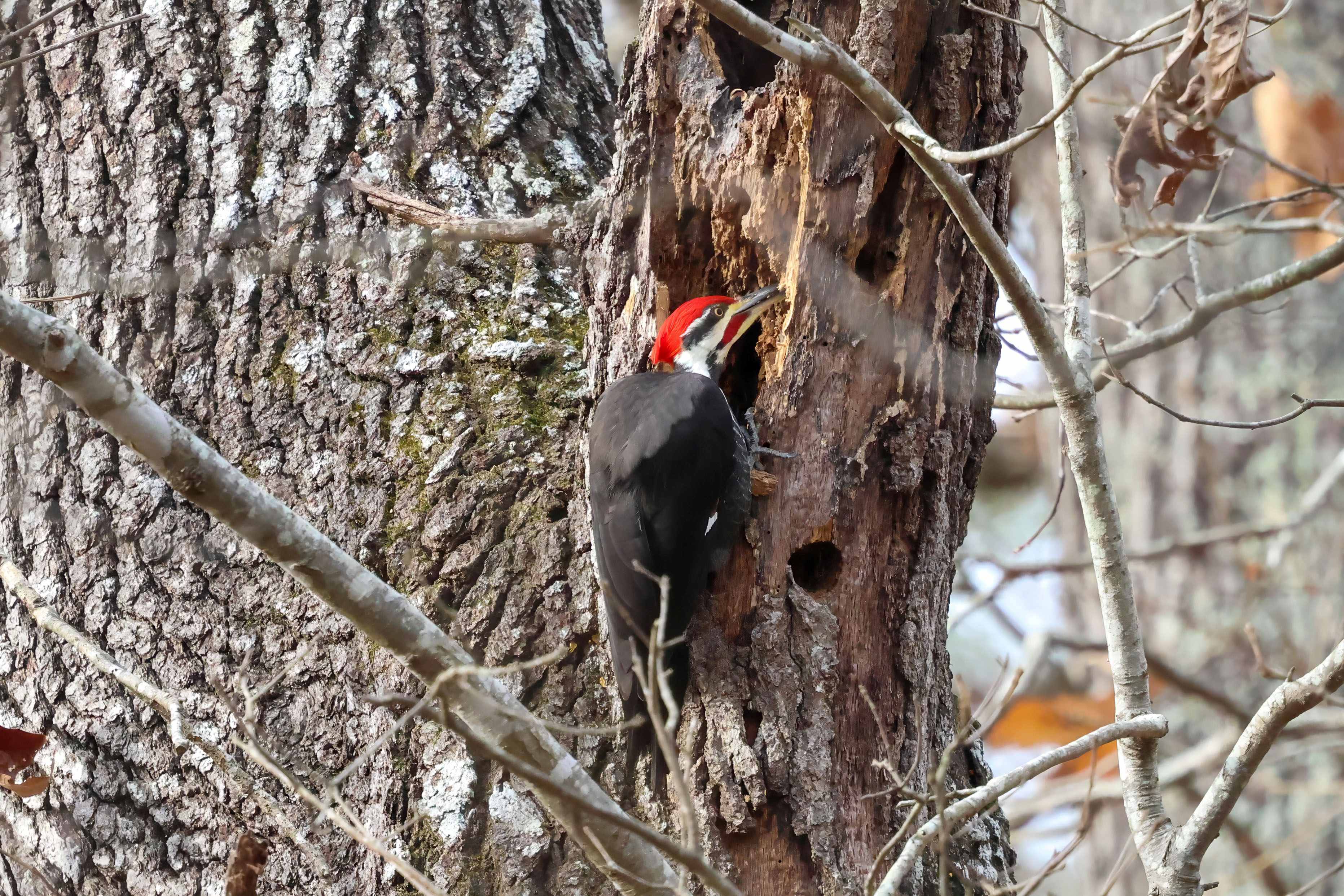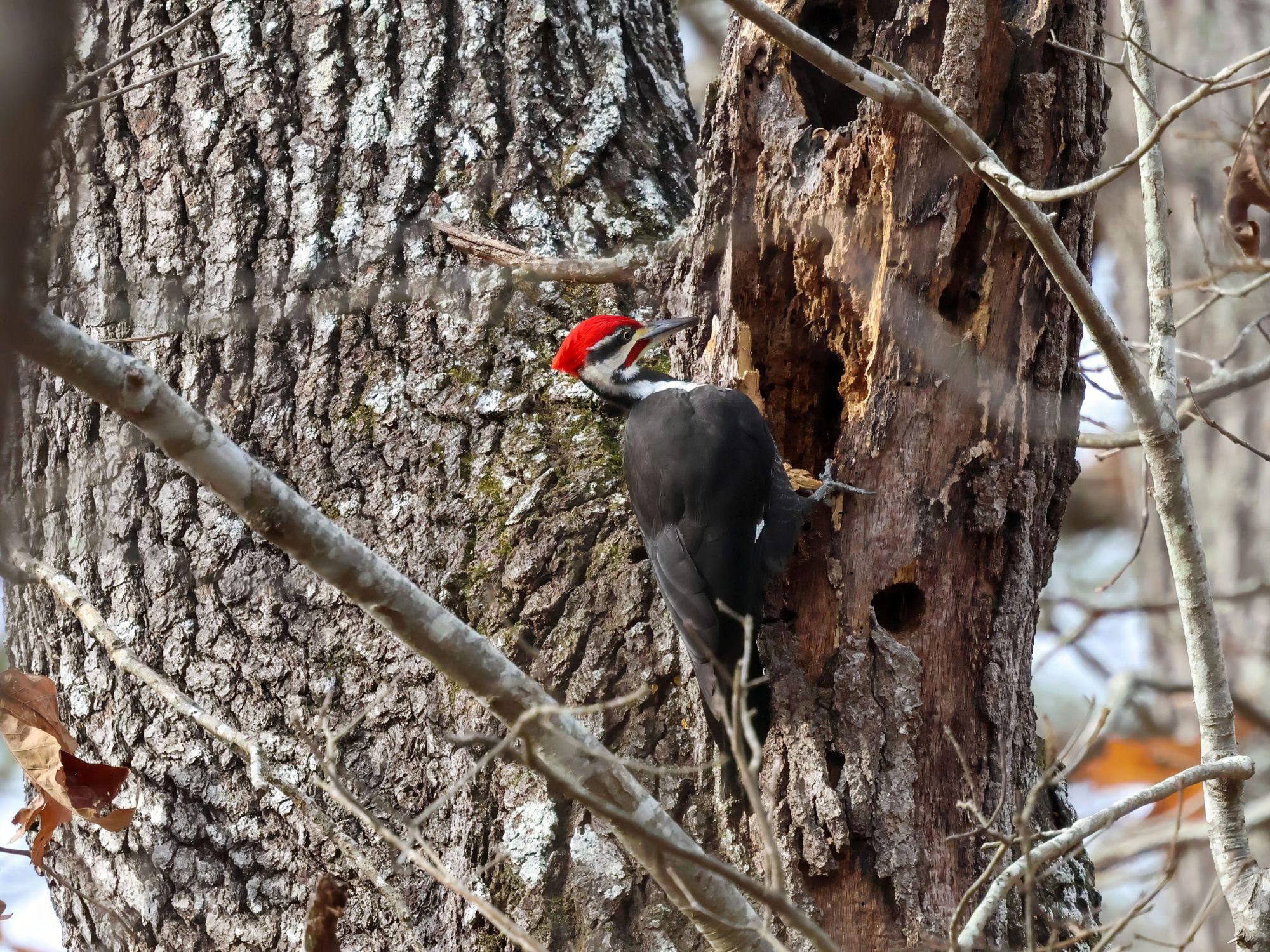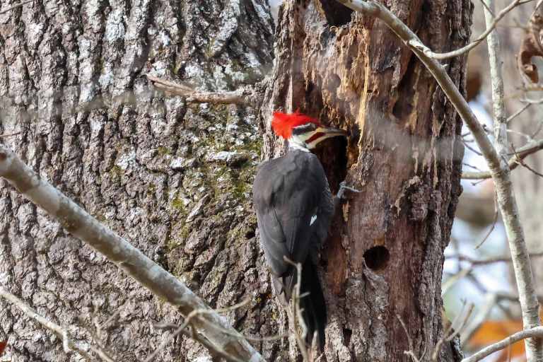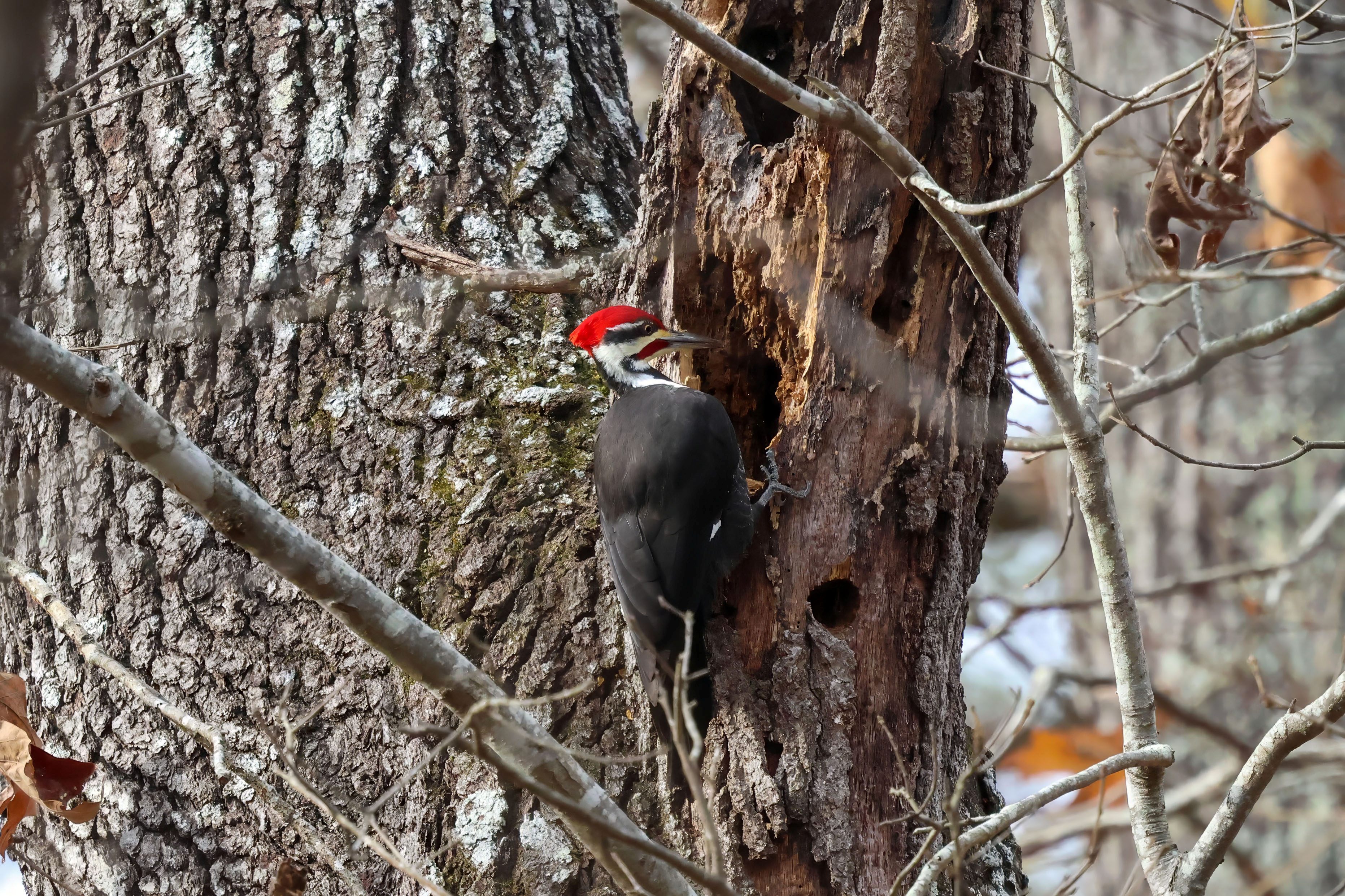 Much to my delight, it turned out to be a pair of these prehistoric looking woodpeckers, who were busy exploring and excavating holes in my neighbor’s backyard trees. These birds are about the same size as a crow. The female (below) only has a partial red crown and a black mustache on the side of her face…