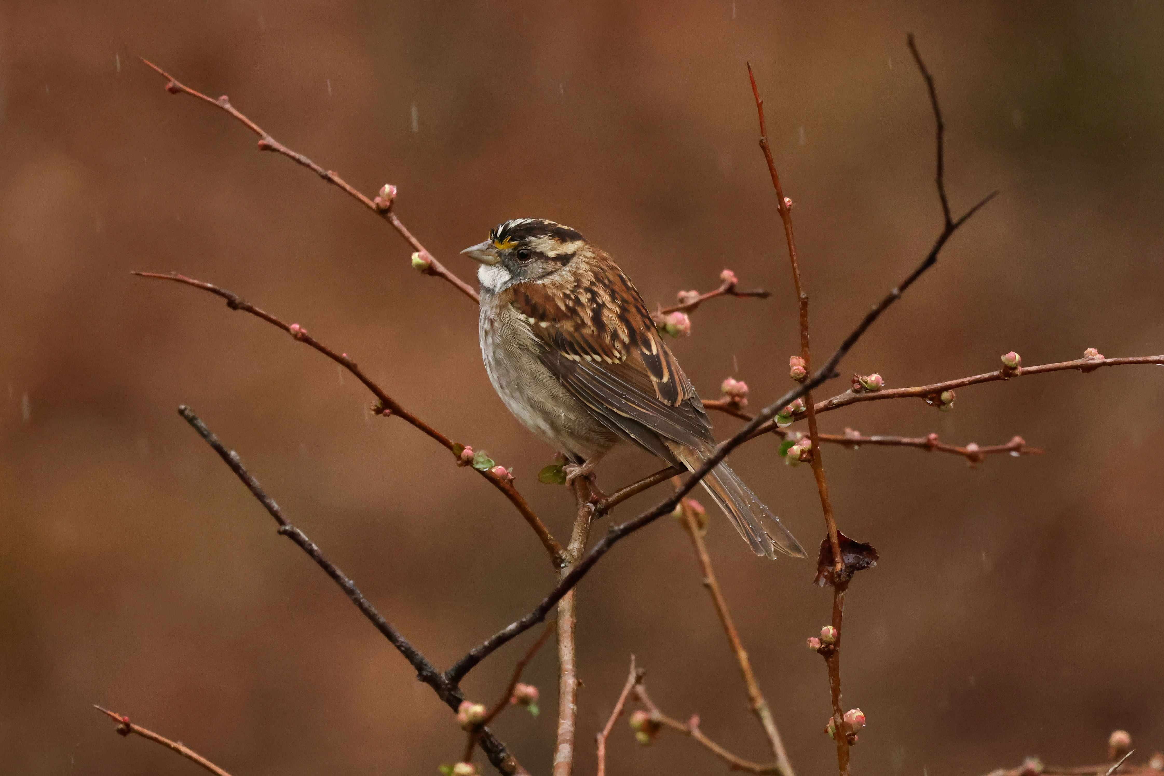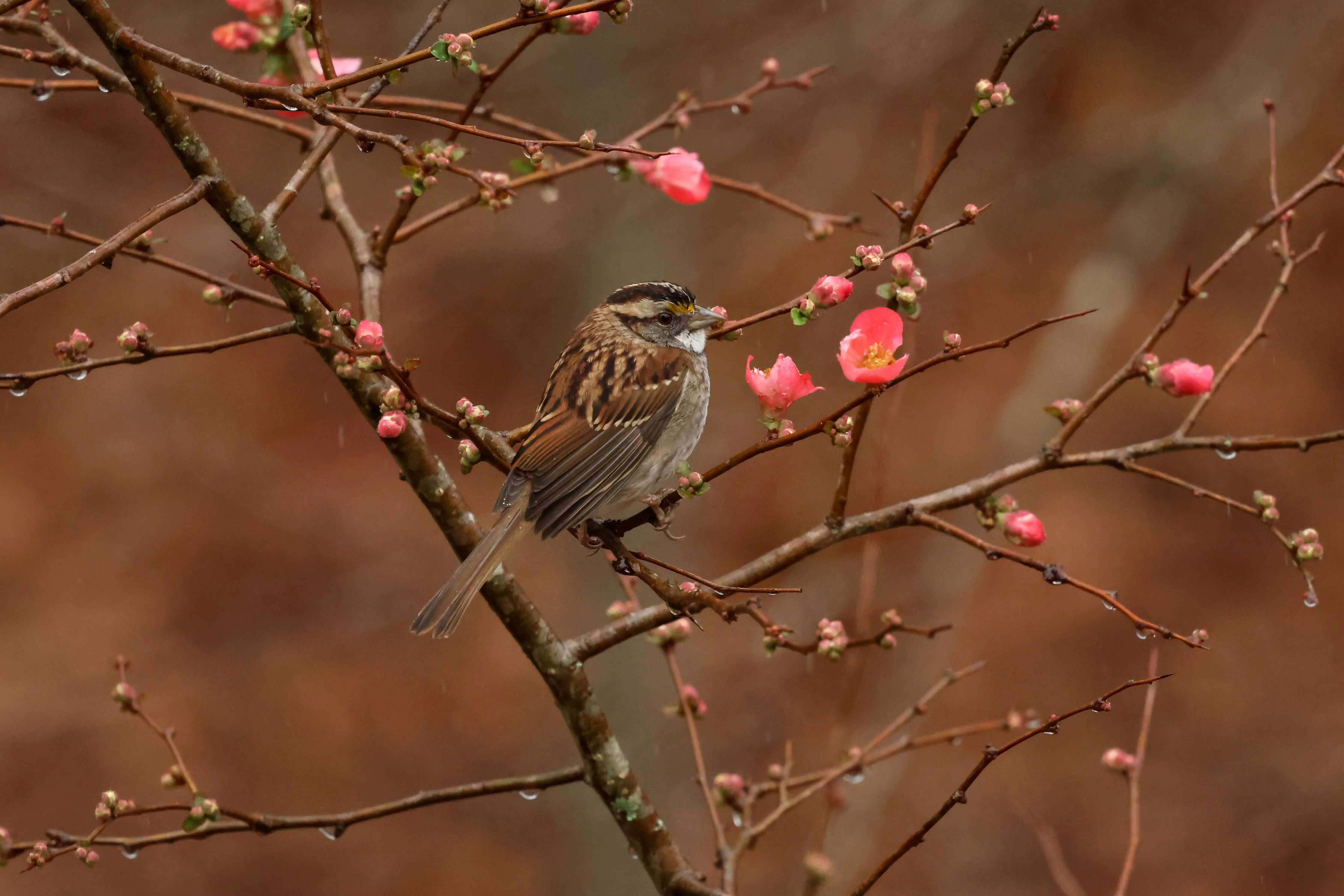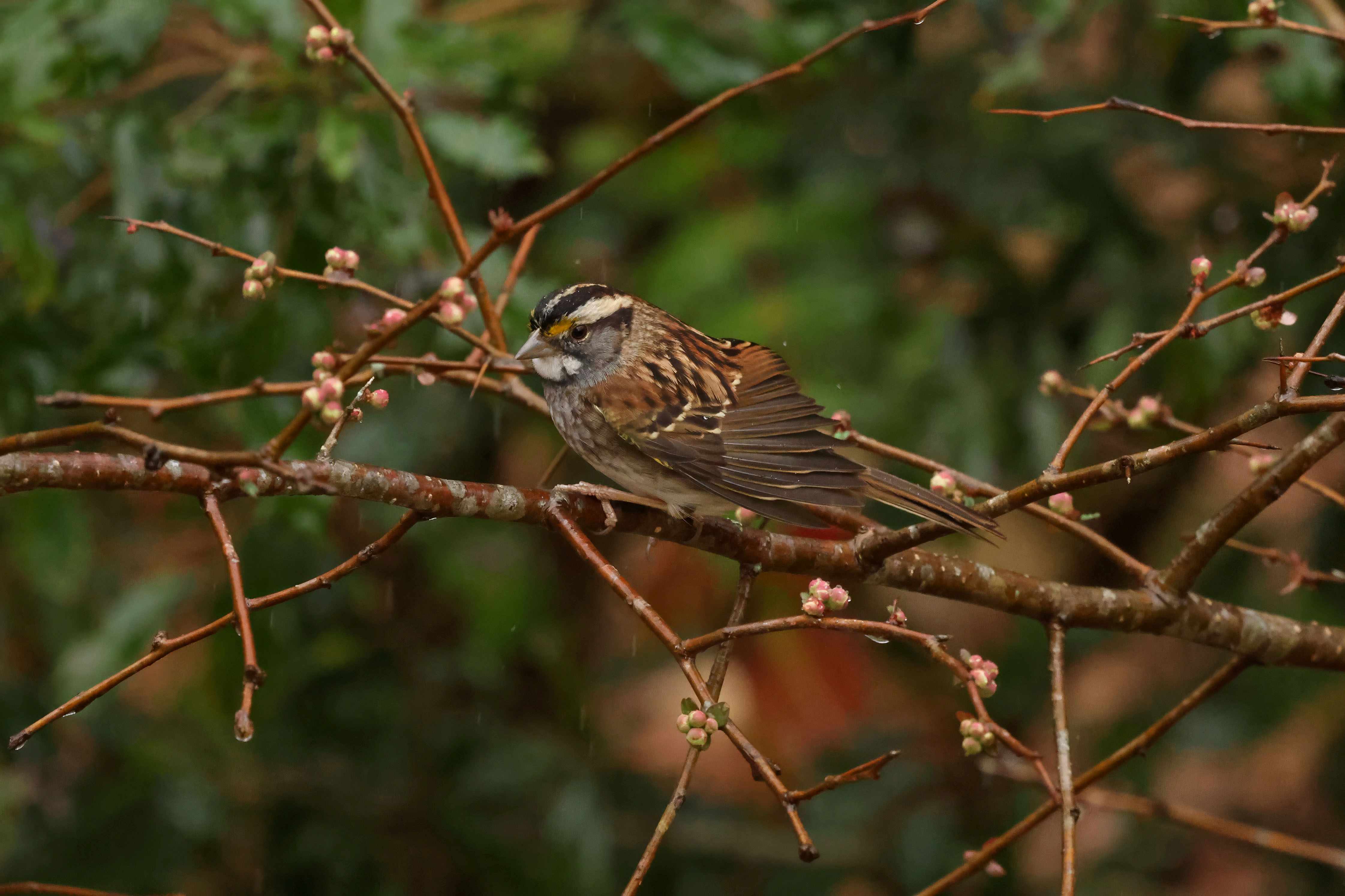We had a lovely rain the other day, and a handful of White-throated Sparrows were perched in the Quince bush, enjoying a gentle soaking.