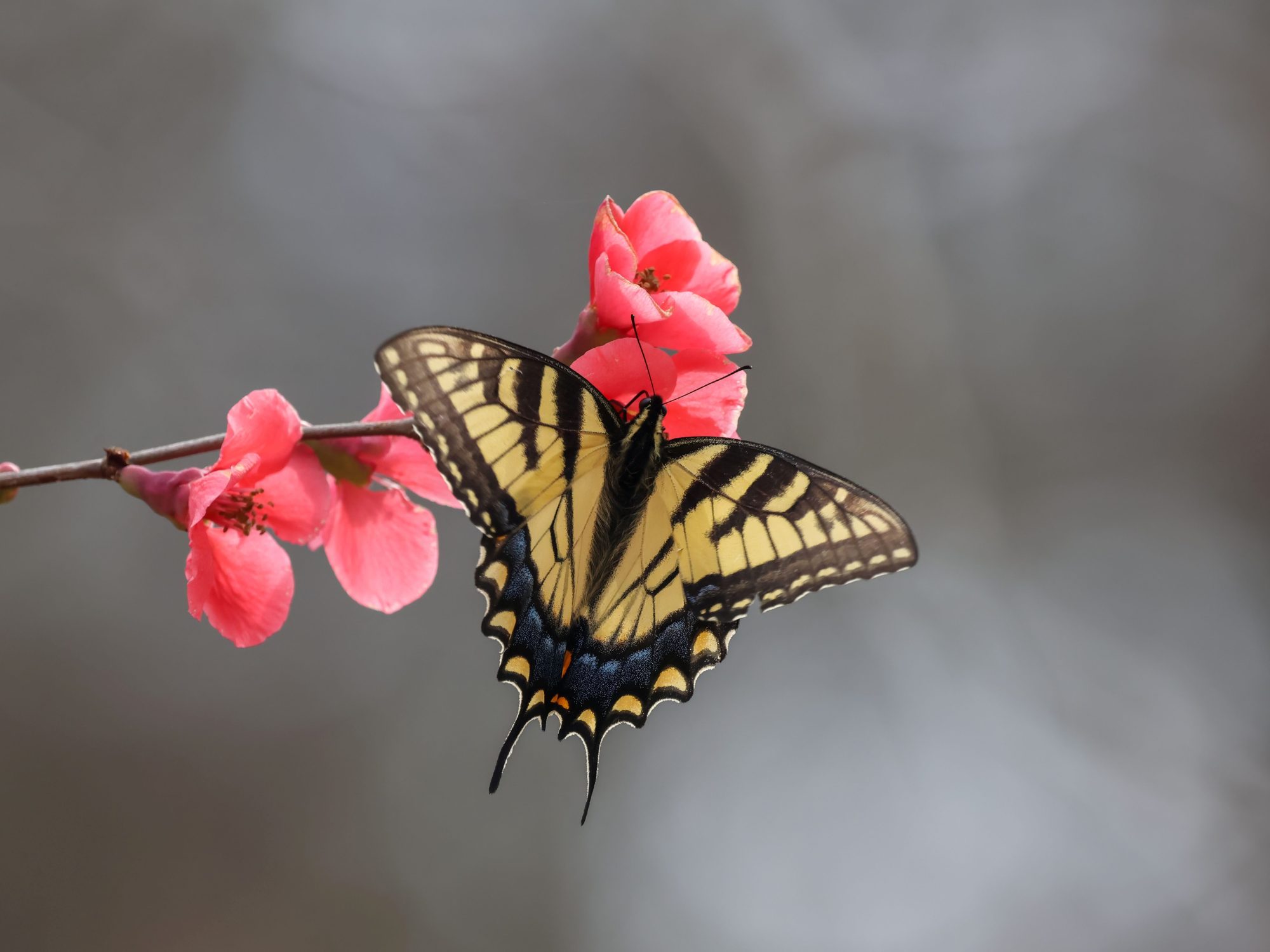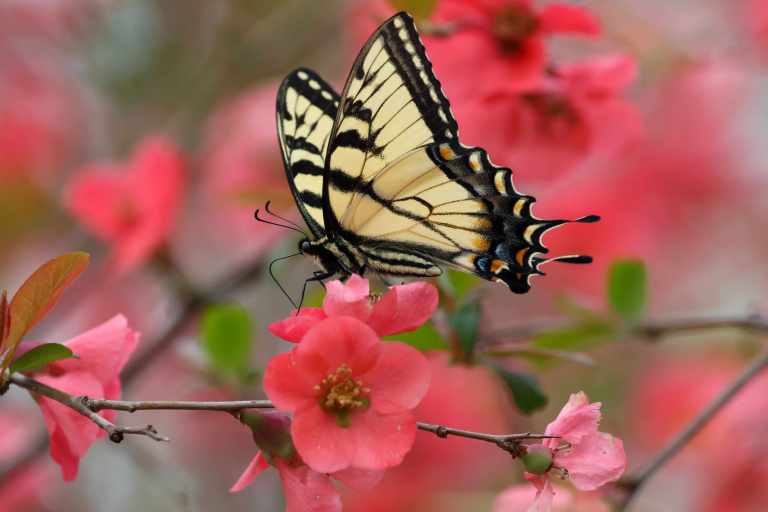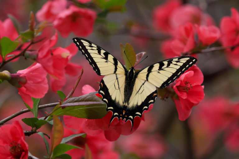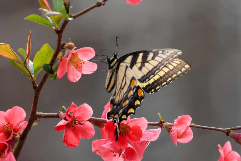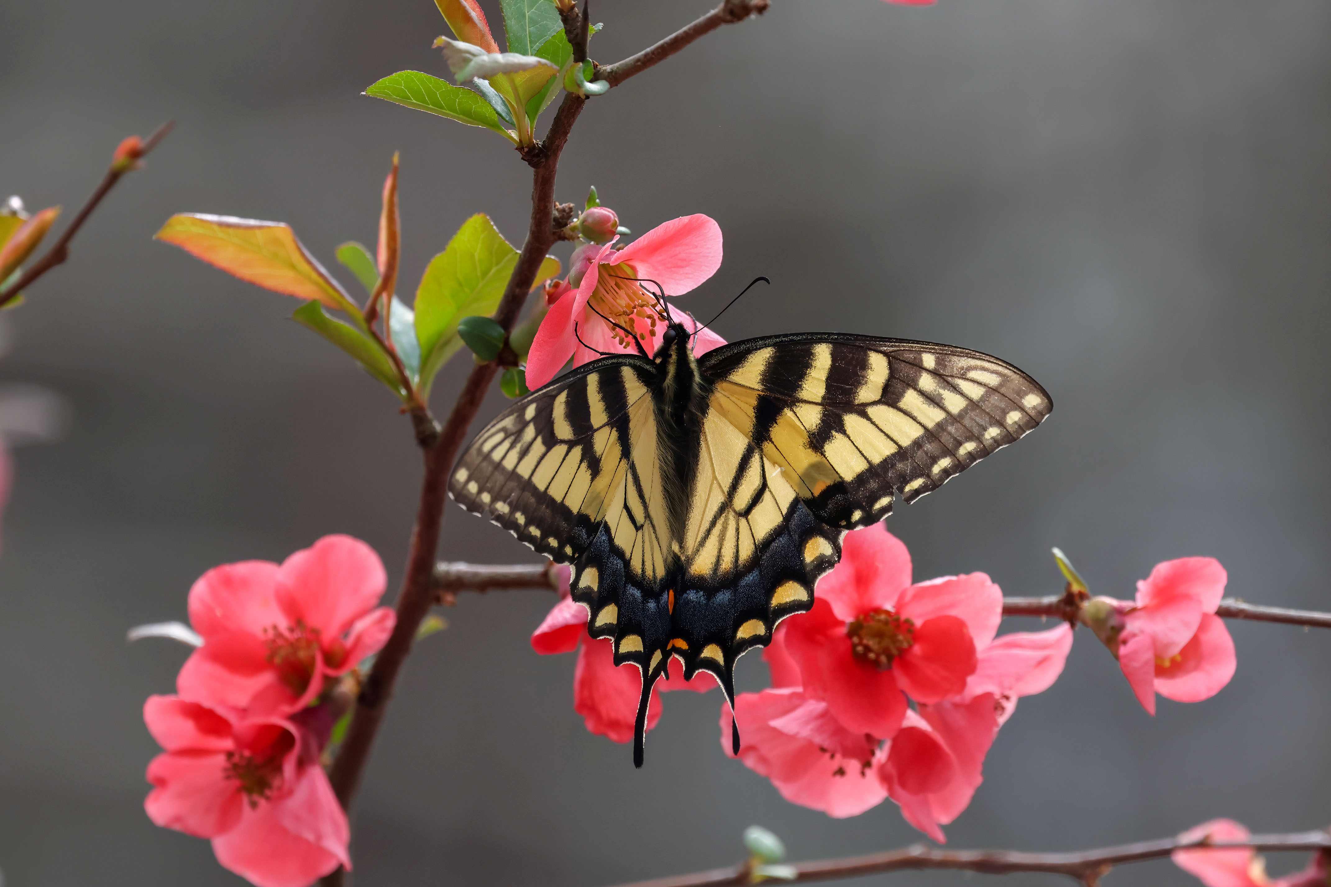 Our flowering quince in the side yard is in full bloom, and has drawn the attention of two early arriving Tiger Swallowtails.