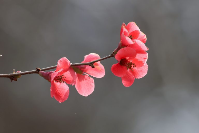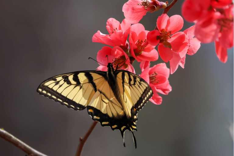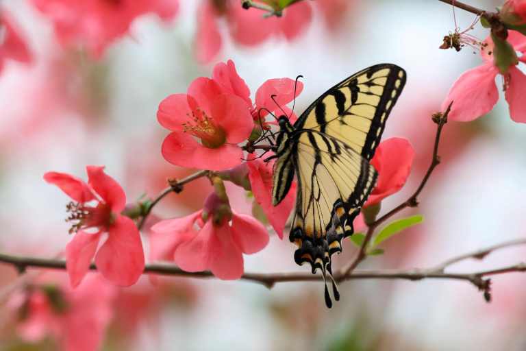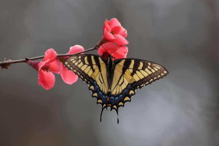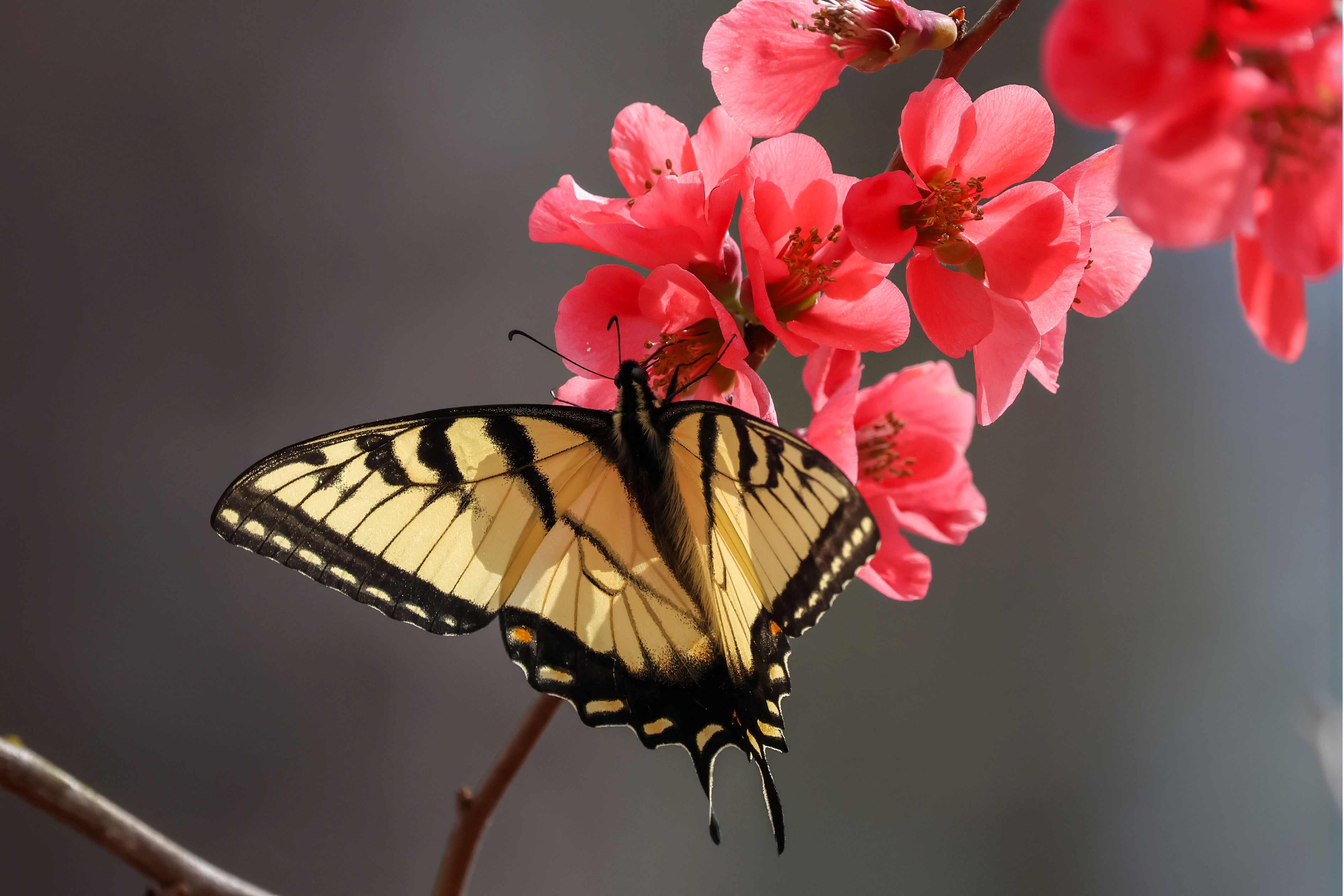 Our flowering quince in the side yard is in full bloom, and has drawn the attention of two early arriving Tiger Swallowtails.