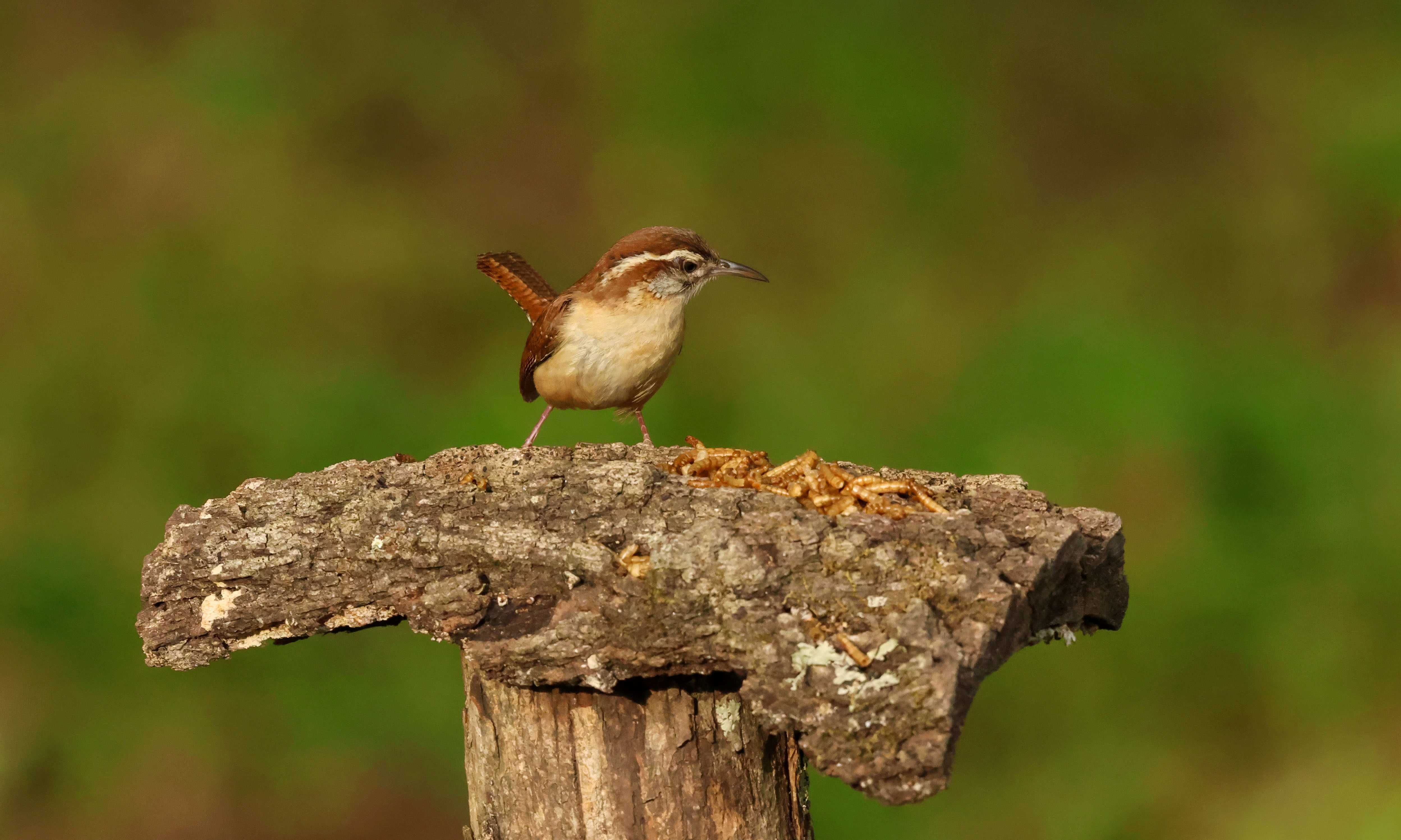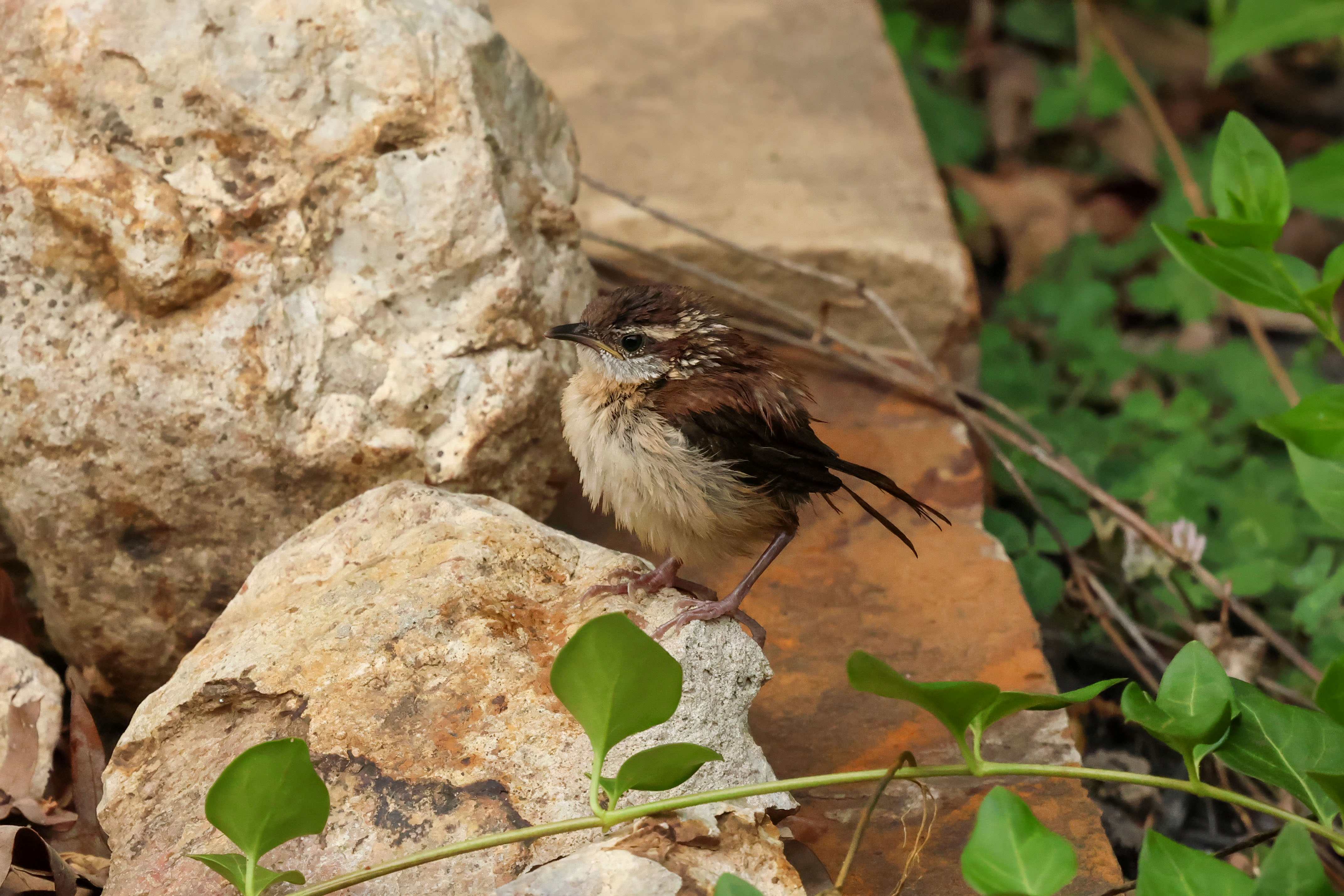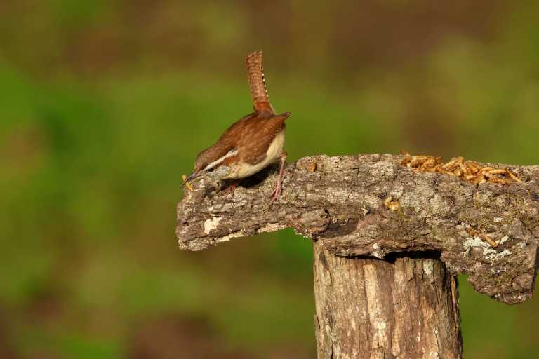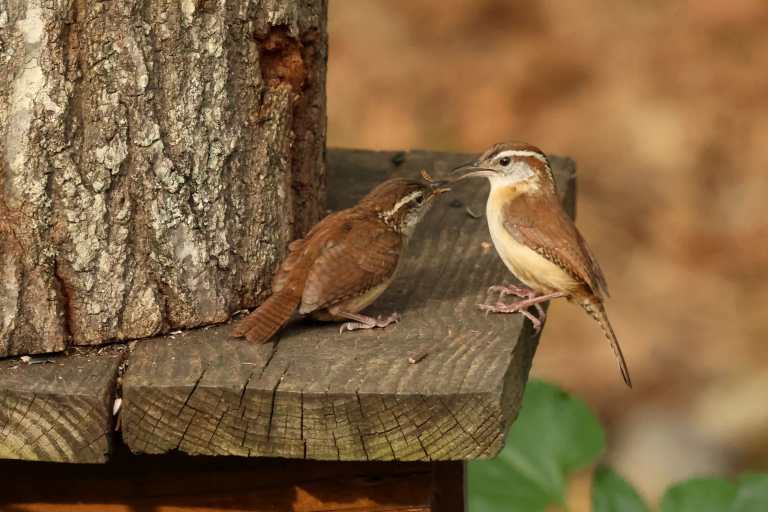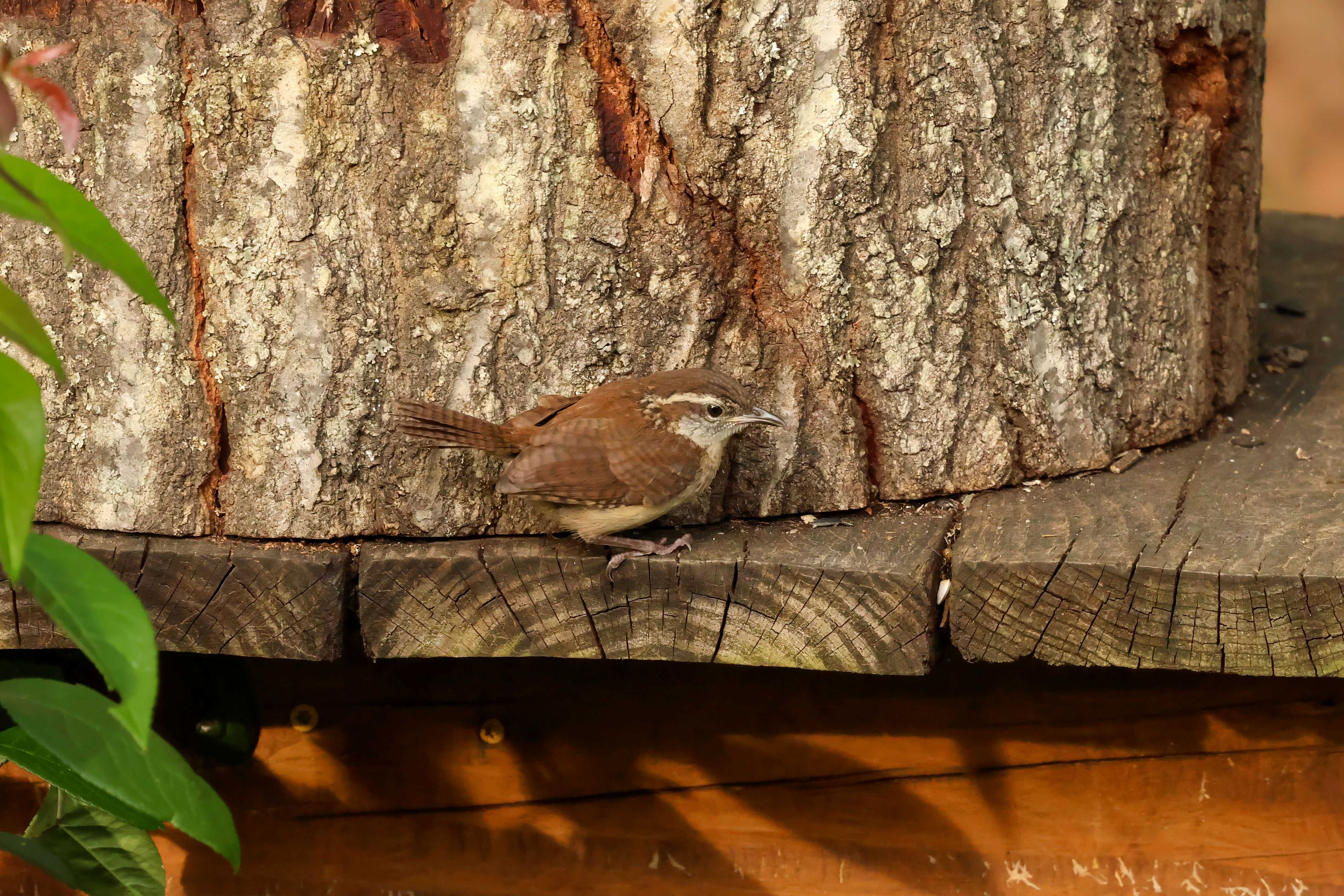 Well…shortly after I shared that there was a nest of four little Carolina Wrens residing on my back deck, Mama moved them out of their overcrowded accommodations and resettled them in a brush pile at the edge of the yard. She spent several days doing her best impression of door-dash – flying back and forth, delivering mealworms from the feeding station to the demanding youngsters.