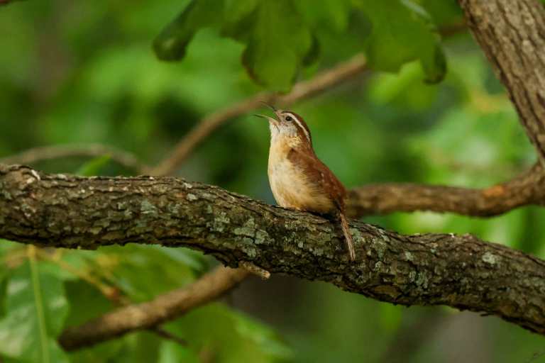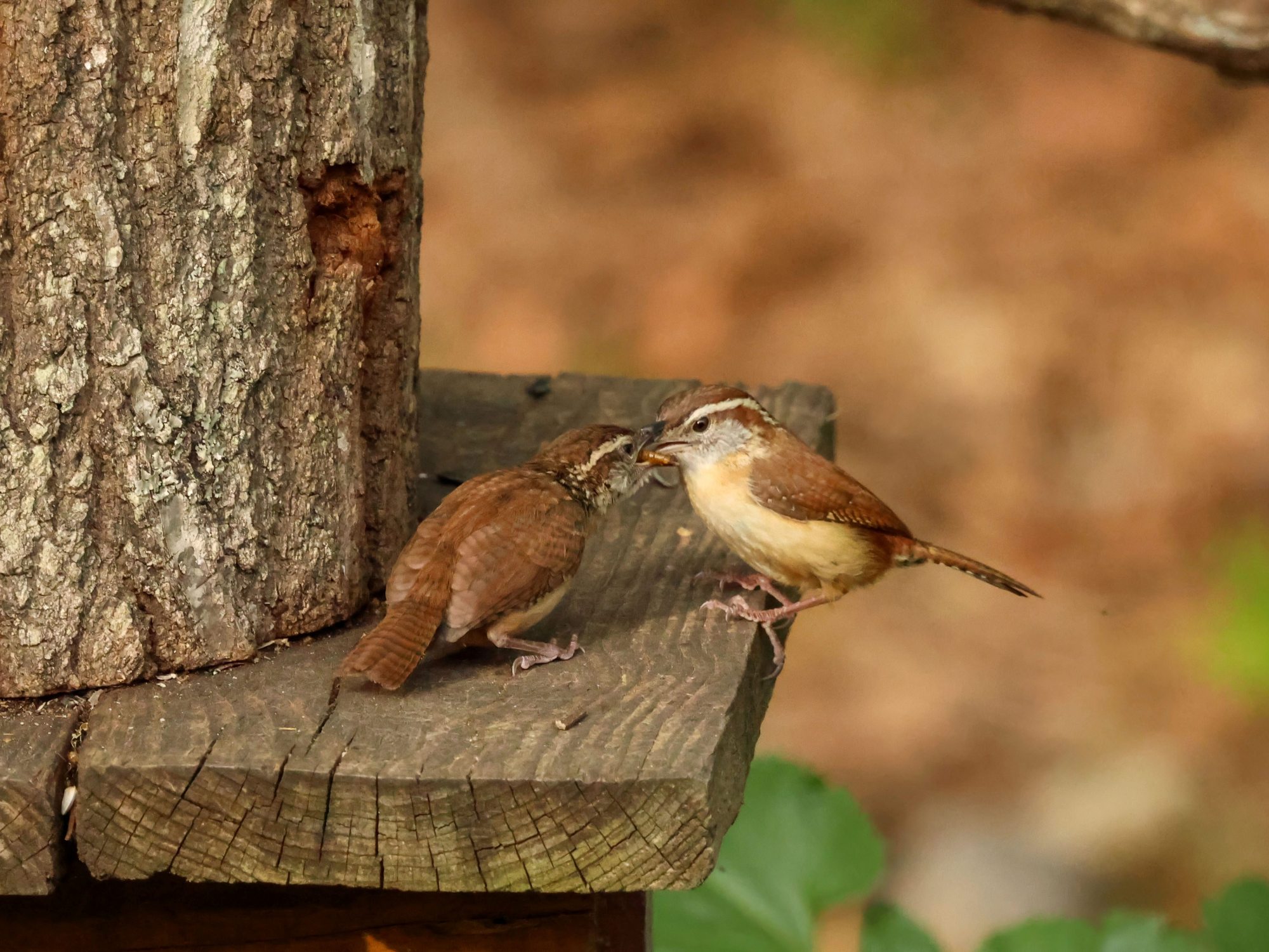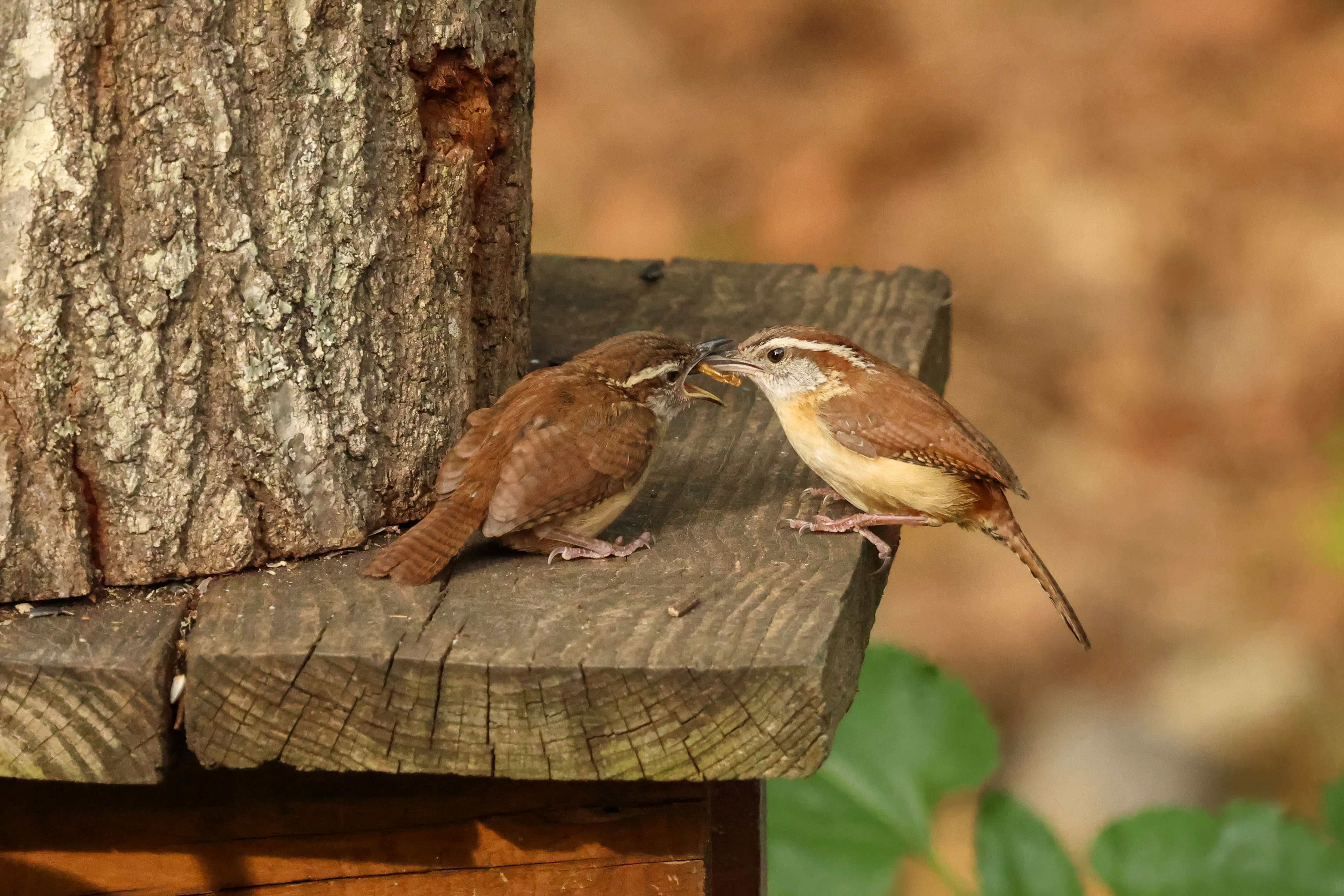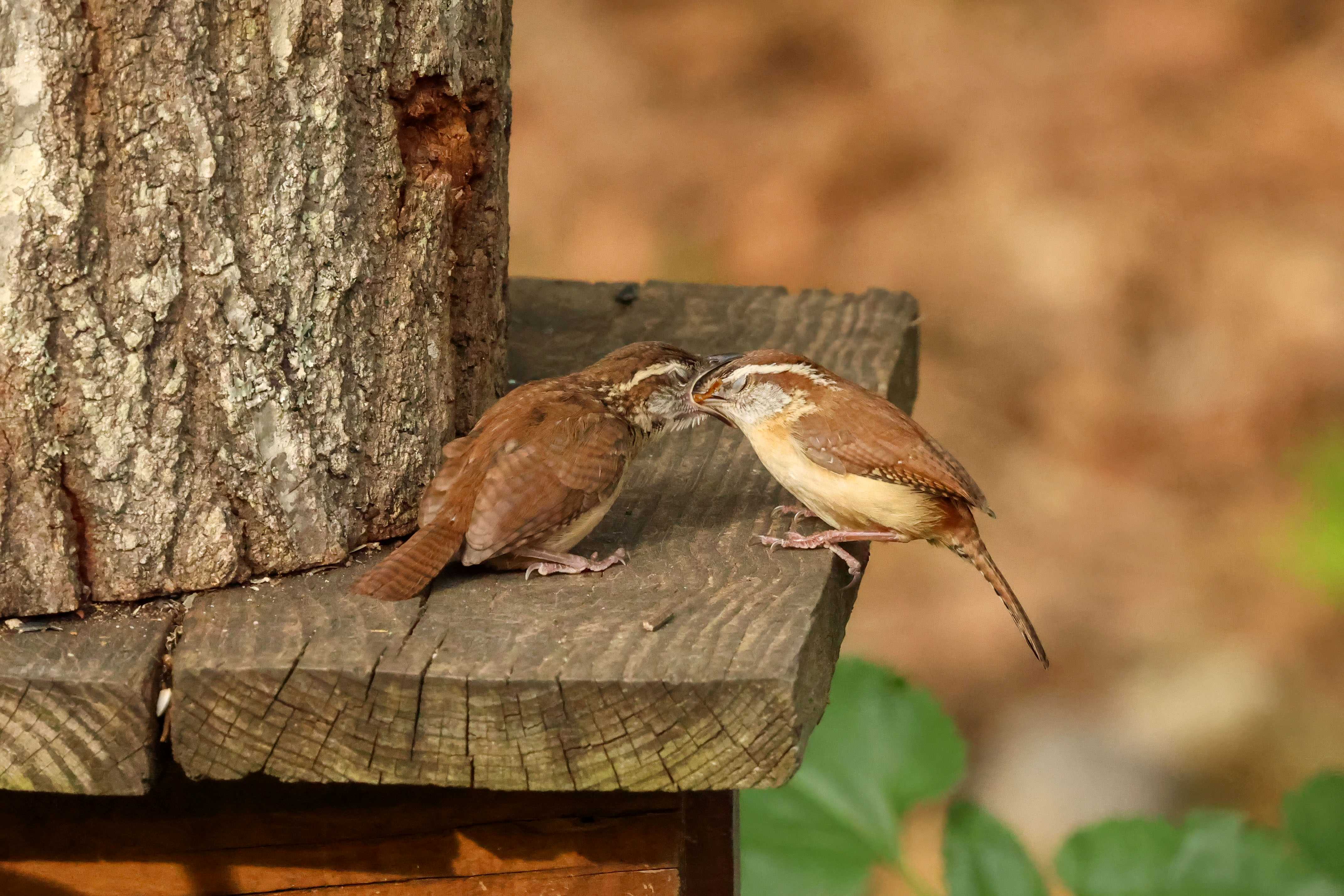 Well…shortly after I shared that there was a nest of four little Carolina Wrens residing on my back deck, Mama moved them out of their overcrowded accommodations and resettled them in a brush pile at the edge of the yard. She spent several days doing her best impression of door-dash – flying back and forth, delivering mealworms from the feeding station to the demanding youngsters.
